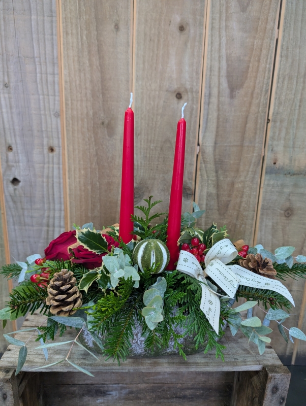 This arrangement is available with Red or Green candles. Please let me know in the instructions box which you would like.